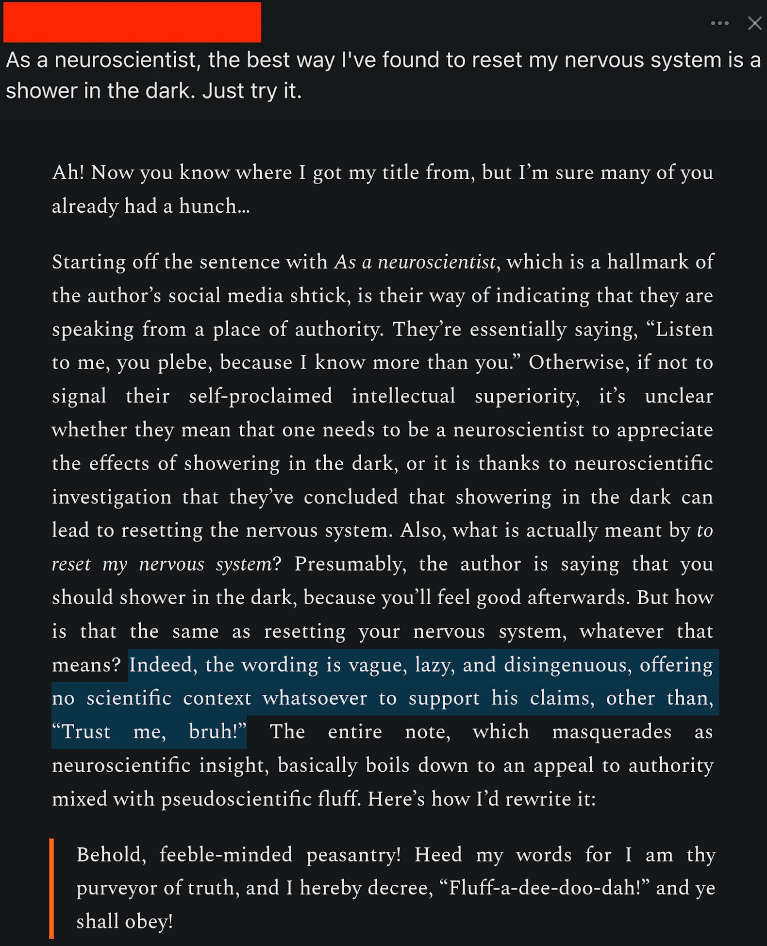 In a previous essay1 on the topic of online neuroscientific charlatanism, titled Substack offered me a Faustian bargain: “As a neuroscientist,” I turned it down..., I discussed just how important contextual nuance is to truth as it pertains to scientific claims. To judiciously arbitrate its veracity, a proposition must be set within the confines of well-established parameters, and this is true not only of scientific claims but any claim in general: context is everything. Consider the following passage in which I break down one such ill-defined assertion made by a self-anointed neuroscientist (highlight added by myself):