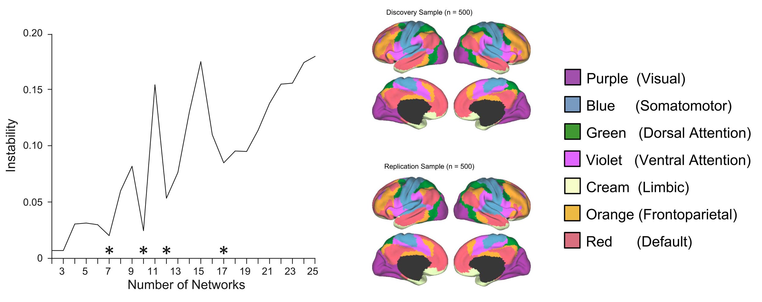 ![Figure 6. [Yeo et al. (2011)] (left) “Seven and 17 networks can be stably estimated. Instability of the clustering algorithm is plotted as a function of the number of estimated networks for the vertex-resampling variant of the stability analysis applied to 1,000 subjects. The clustering algorithm is less stable with increasing number of estimated networks, which is an expected property, since the number of estimated networks enlarges the solution space (and thus complexity) of the clustering problem.” | (right) “Discovery and replication of a 7-network cortical parcellation. The 7-network estimates are highly consistent across the discovery (n 500) and replication (n 500) data sets.” NB: the ventral attention network is also known as the salience network. Figure 6. [Yeo et al. (2011)] (left) “Seven and 17 networks can be stably estimated. Instability of the clustering algorithm is plotted as a function of the number of estimated networks for the vertex-resampling variant of the stability analysis applied to 1,000 subjects. The clustering algorithm is less stable with increasing number of estimated networks, which is an expected property, since the number of estimated networks enlarges the solution space (and thus complexity) of the clustering problem.” | (right) “Discovery and replication of a 7-network cortical parcellation. The 7-network estimates are highly consistent across the discovery (n 500) and replication (n 500) data sets.” NB: the ventral attention network is also known as the salience network.](https://substackcdn.com/image/fetch/$s_!L8i4!,w_1456,c_limit,f_auto,q_auto:good,fl_progressive:steep/https%3A%2F%2Fsubstack-post-media.s3.amazonaws.com%2Fpublic%2Fimages%2F5f849c7b-952c-44b3-a693-fa7119317145_2492x990.png)
