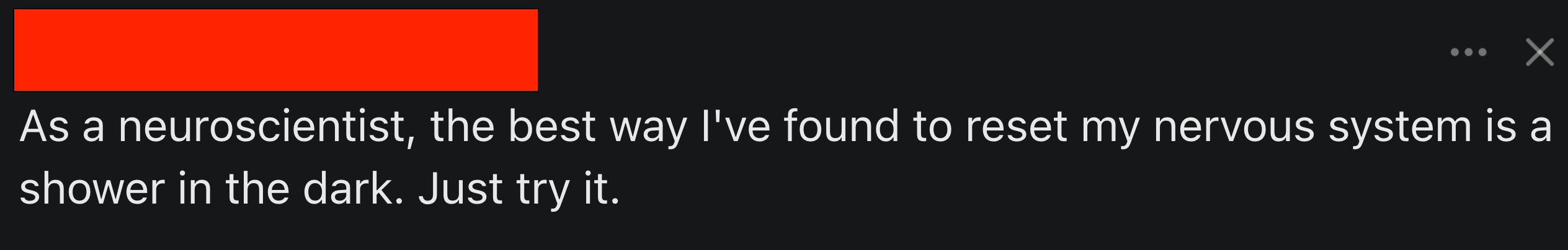 Starting off the sentence with As a neuroscientist, which is a hallmark of the author’s social media shtick, is their way of indicating that they are speaking from a place of authority. They’re essentially saying, “Listen to me, you plebe, because I know more than you.” Otherwise, if not to signal their self-proclaimed intellectual superiority, it’s unclear whether they mean that one needs to be a neuroscientist to appreciate the effects of showering in the dark, or it is thanks to neuroscientific investigation that they’ve concluded that showering in the dark can lead to resetting the nervous system. Also, what is actually meant by to reset my nervous system? Presumably, the author is saying that you should shower in the dark, because you’ll feel good afterwards. But how is that the same as resetting your nervous system, whatever that means? Indeed, the wording is vague, lazy, and disingenuous, offering no scientific context whatsoever to support his claims, other than, “Trust me, bruh!” The entire note, which masquerades as neuroscientific insight, basically boils down to an appeal to authority mixed with pseudoscientific fluff. Here’s how I’d rewrite it:
