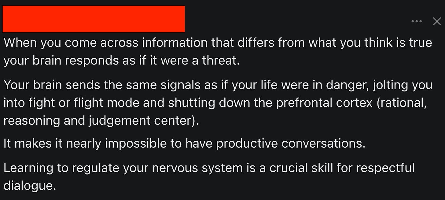 Ok, be mindful of what you say when you disagree with someone if your intention is to have an open-ended, honest conversation with them. But what’s the point of this note? If the purpose was to reveal something worthwhile about the brain and the sympathetic system, I dare say the author missed the mark as the neuroscience it conveys is very weak. Otherwise, if the motive was to provide commentary about general etiquette and respect, then why have recourse to all that fluff about the brain? This is not neuroscience, ladies and gentlemen. This is garbage, which—if you’re a premium subscriber to the account in question—you pay to consume. I can’t imagine this kind of bunk being healthy for your brain…