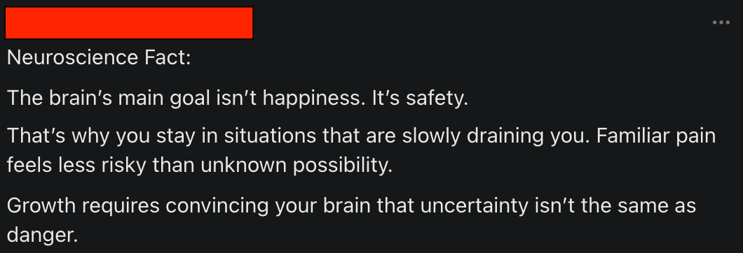 I chose to redact the identities of the social media grifters whose works I criticize in this piece, because my intention is not to single out anyone in particular, but to highlight the asininity, vagueness, and triteness of their online content, which constitute the modus operandi of almost all neuroscience snake oil salesmen.